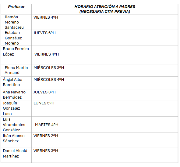 HORARIO DE ATENCIÓN A PADRES, MADRES Y TUTORES LEGALES: